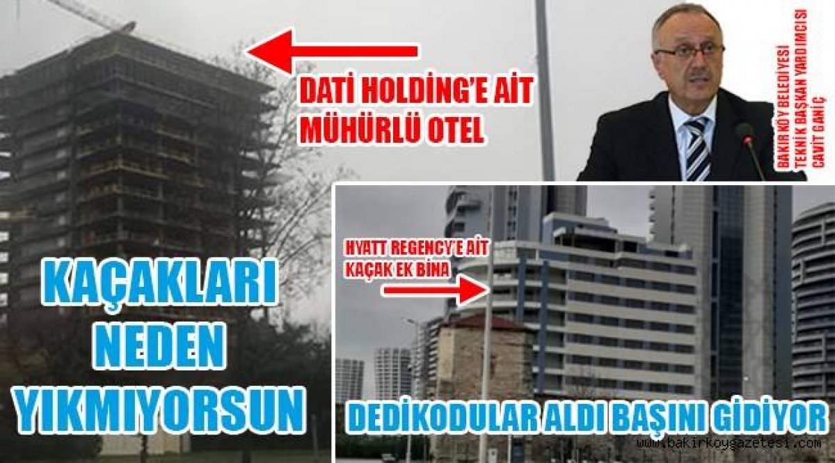 Ataköy sahilinde bulunan Dati Holding e ait otel inşaatı ve Hyatt Regency ait ek kaçak binanın neden yıkılmadığını Bakırköy kamuoyu merak ediyor. Gazetemiz ihbar hattına ilginç belgeler ve fotoğraflar gelmekte bu konularla ilgili olarak ...