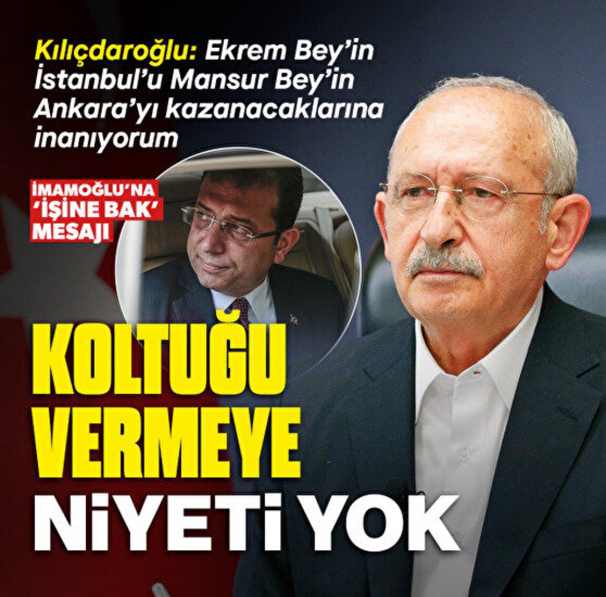 CHP Genel Başkanı Kemal Kılıçdaroğlu, partideki değişim hareketine öncülük eden İBB Başkanı Ekrem İmamoğlu'na 'görevinde kal' mesajı gönderdi. İstifa çağrılarına kulak tıkayan CHP lideri, genel başkanlık isteyen İmamoğlu'nun yeniden İBB Başkan adayı olması gerektiğini söyledi. Kılıçdaroğlu, “Ekrem Bey’in İstanbul’u, Mansur Bey’in Ankara’yı kazanacaklarına inanıyorum" dedi.